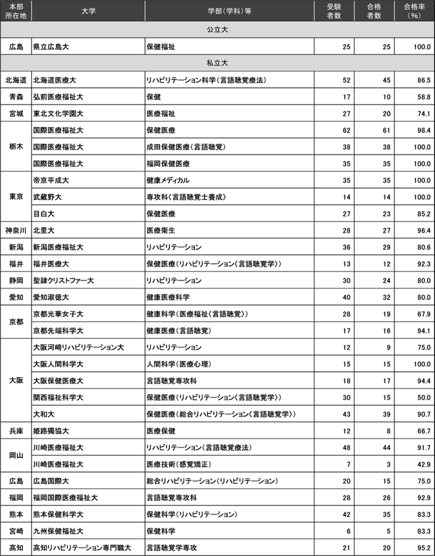 言語聴覚士国家試験は、学校別の合格率も発表されています。学校別の合格率を確認することで、養成校選びの参考になるでしょう。ここでは、2023年度(第25回)の言語聴覚士国家試験の、学校別合格率について解説します。学校別合格者数一覧